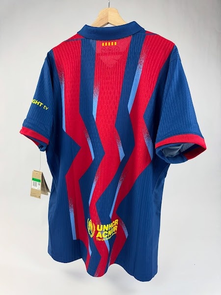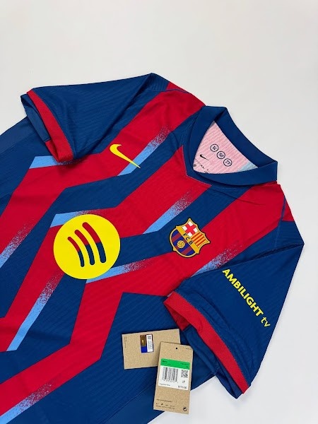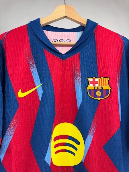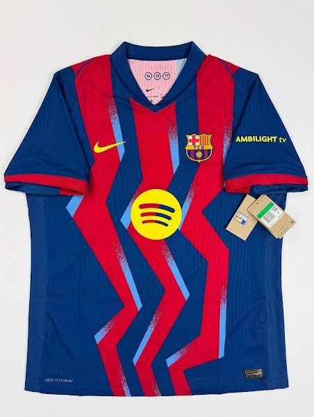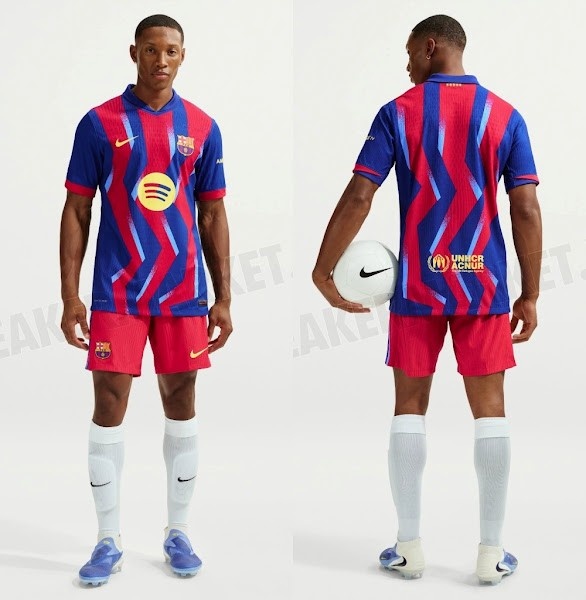 与20年前的经典蓝红条纹不同,巴塞罗那2025-26赛季第四球衣取舍了蓝色和红色的锯齿形条纹,并带有浅蓝色的图形元素。