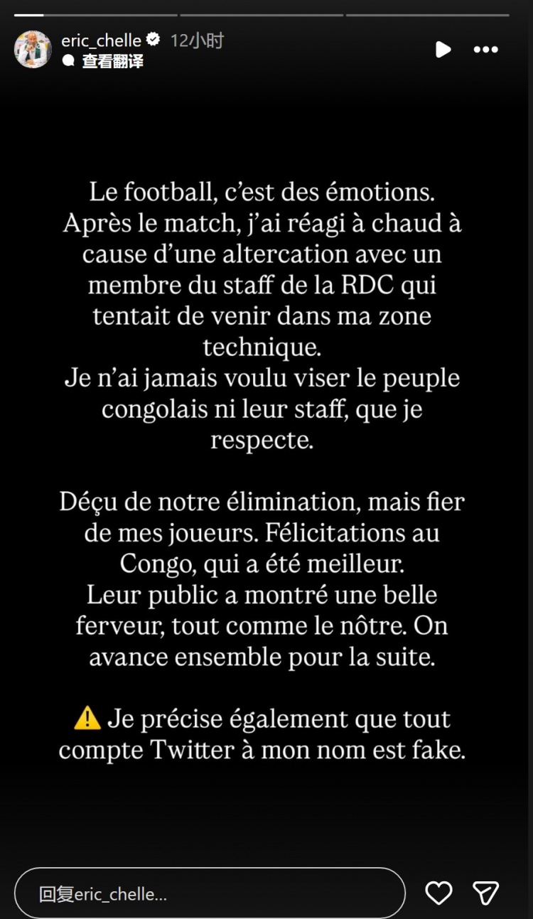 天然球队出局令我感到失望,但我为我的球员们感到骄横。道贺民主刚果,他们推崇更好。他们的球迷展现了极大的温雅,咱们的球迷也雷同。让咱们沿途上前看,迎接过去。