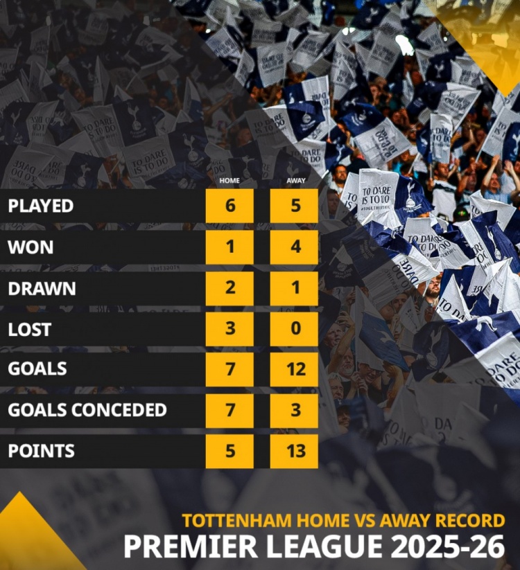 11月23日讯 北京工夫未来凌晨,热刺将在英超第12轮比赛中客场对阵阿森纳。Opta统计了热刺本赛季英超主客场的数据,并作念出对比,热刺客场拿到13分英超最多,但主场只拿5分。