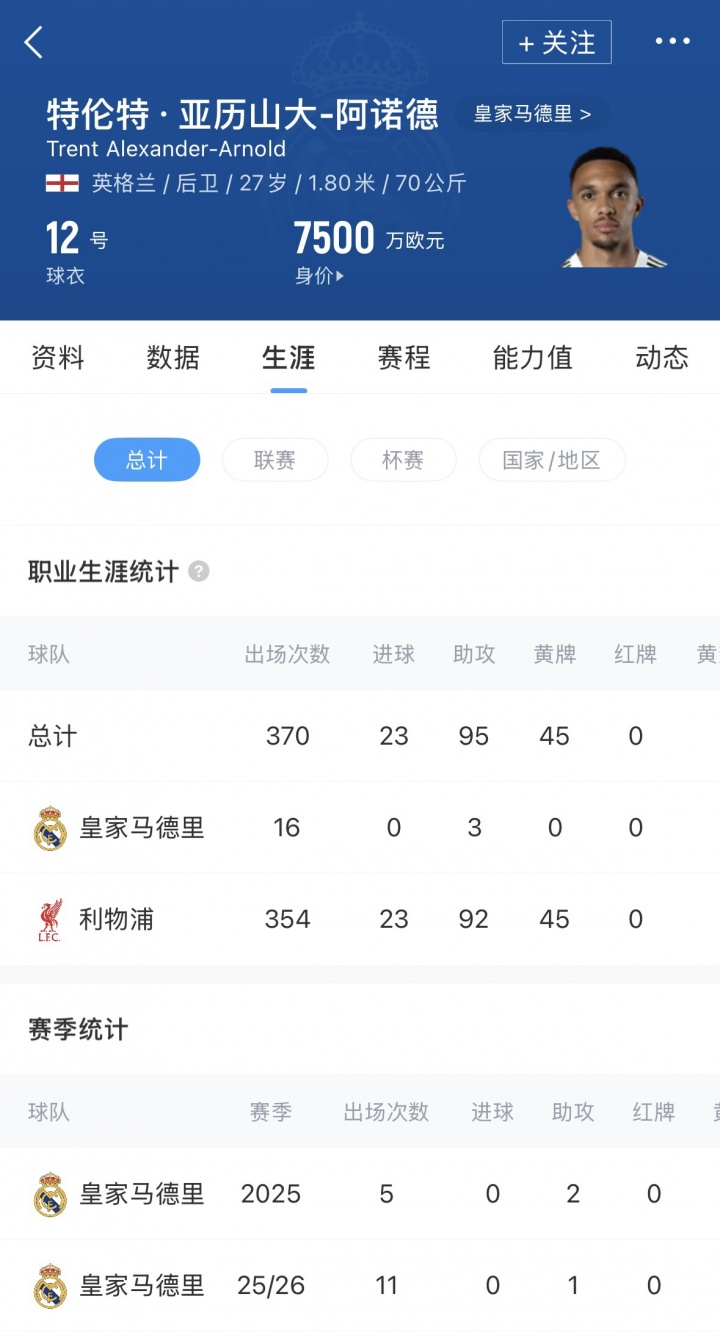阿诺德自加盟皇马以来,饱受伤病困扰,本赛季他代表皇马共出战16场,孝顺3助攻。