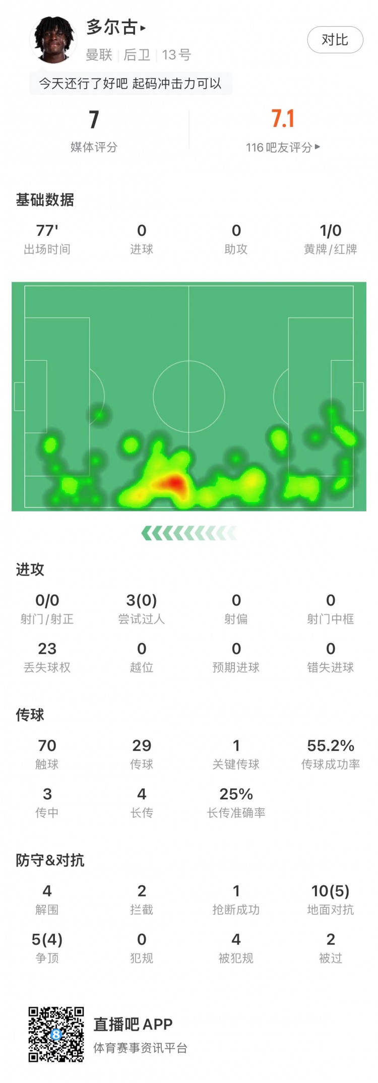 本场多尔古在贯注端阐述积极,他在77分钟里留住4次突围、2次阻抑、1次抢断的出色数据,10次大地挣扎有5次告捷,5次高空争顶有4次告捷。