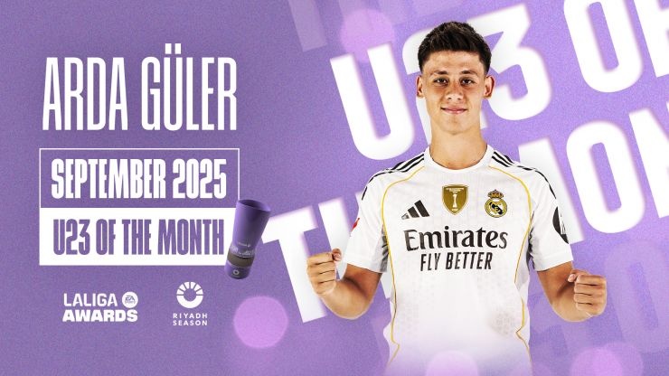 9月30日讯 官方音问,居勒尔荣获9月份西甲最好U23球员奖,