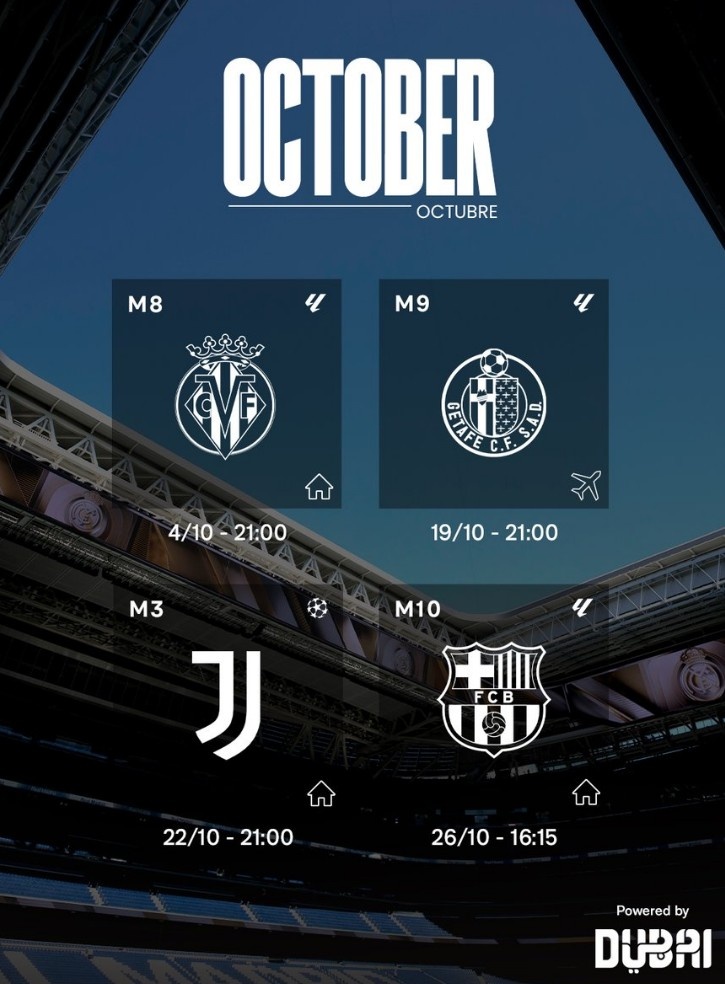 10月3日讯 皇马官推晒出了球队10月份赛程,其中与巴萨的国度德比最为引东谈主详确,以下为具体情况(北京时辰):