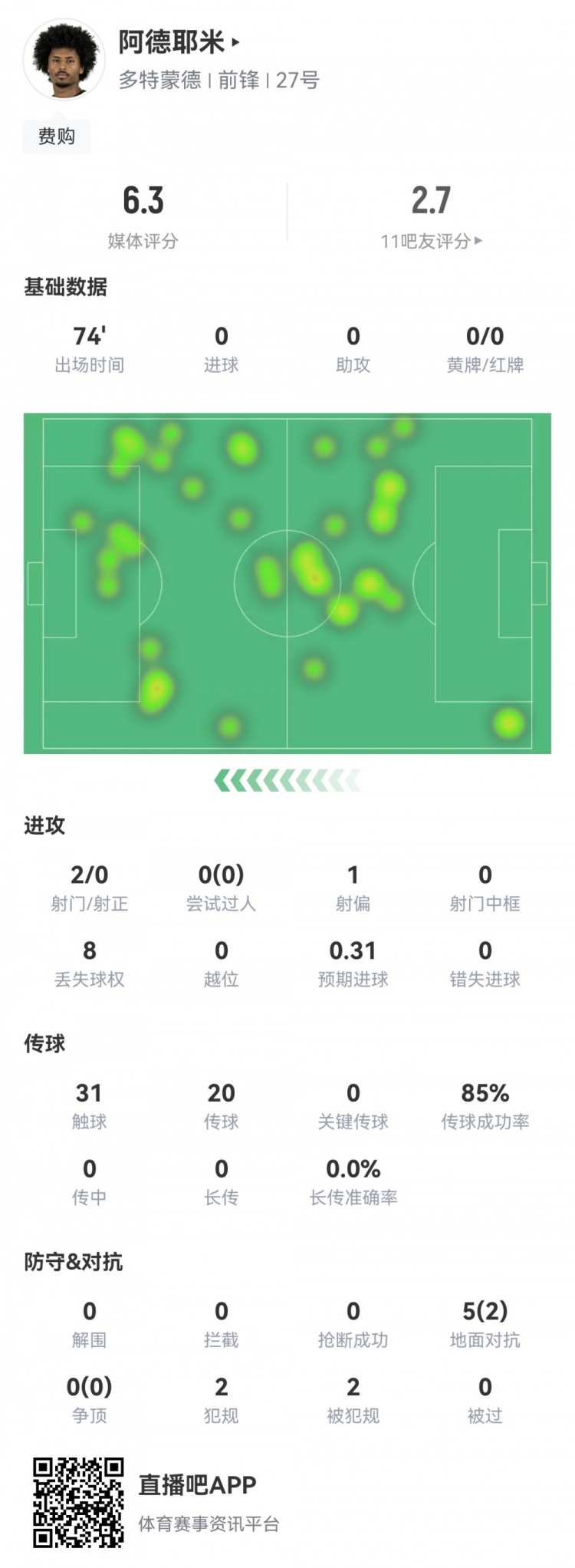 10月19日讯 本轮德甲焦点战,拜仁主场2-1多特。此役阿德耶米首发74分钟被换下,球员全场重心数据如下↓