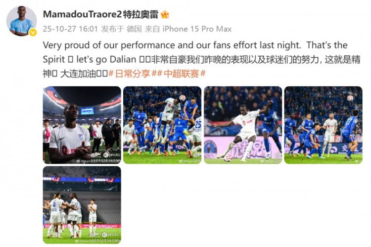 赛后,马马杜-特拉奥雷在社媒写说念:“颠倒自重咱们昨晚的发达以及球迷们的竭力, 这等于精神!大连加油!”