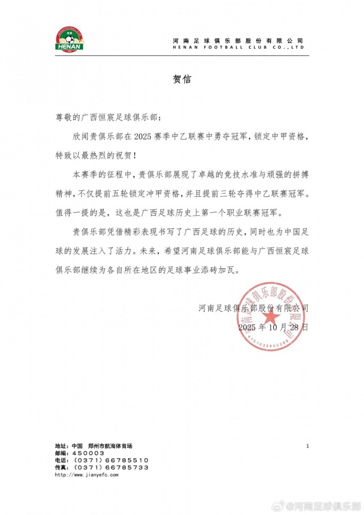 欣闻广西恒宸俱乐部在2025赛季中乙联赛中勇夺冠军,锁定中甲履历,特致以最浓烈的祈福!