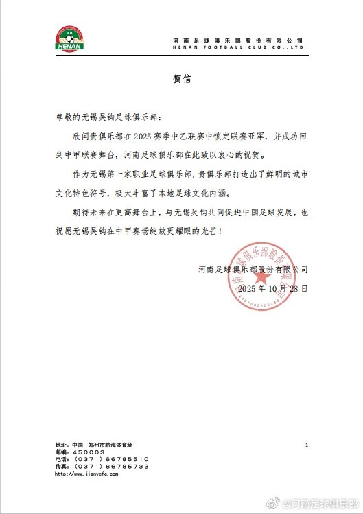 欣闻无锡吴钩俱乐部在2025赛季中乙联赛中锁定联赛亚军,并到手回到中甲联赛舞台,河南足球俱乐部在此致以由衷的祝福。