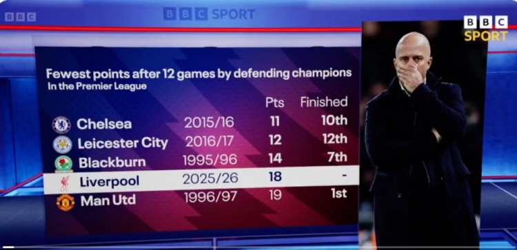 利物浦本赛季英超前12轮比赛仅积18分,成为英超历史同时积分第四少的卫冕冠军。