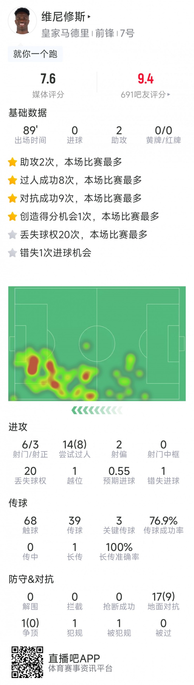 11月27日讯 在本轮欧冠,皇马4-3打败奥林匹亚科斯,以下为维尼修斯本场数据: