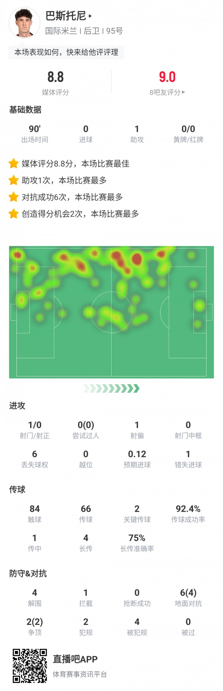 10月1日讯 国米在本轮欧冠3-0大捷布拉格斯拉维亚,巴斯托尼首发出场踢满90分钟,以下是他的个东谈主数据: