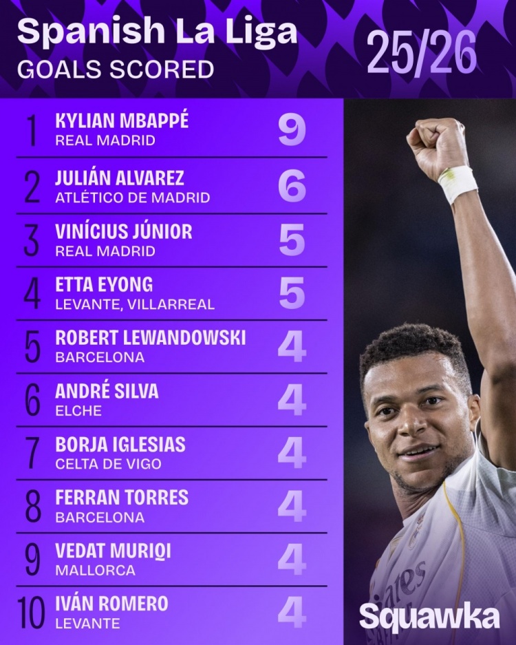 10月7日讯 日前,Squawka统计了本赛季西甲弓手榜,姆巴佩9球居首。