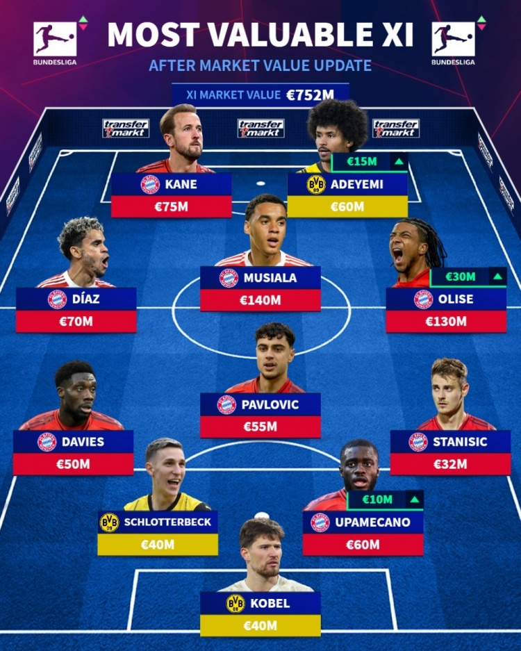 10月15日讯 德转盘货了德甲最高身价威望,整套威望由拜和气多特蒙德球员构成,其中拜仁8东说念主入选,多特3东说念主入选。