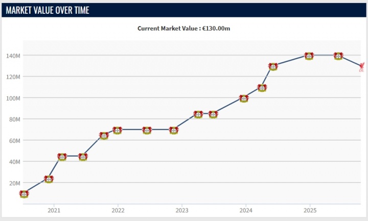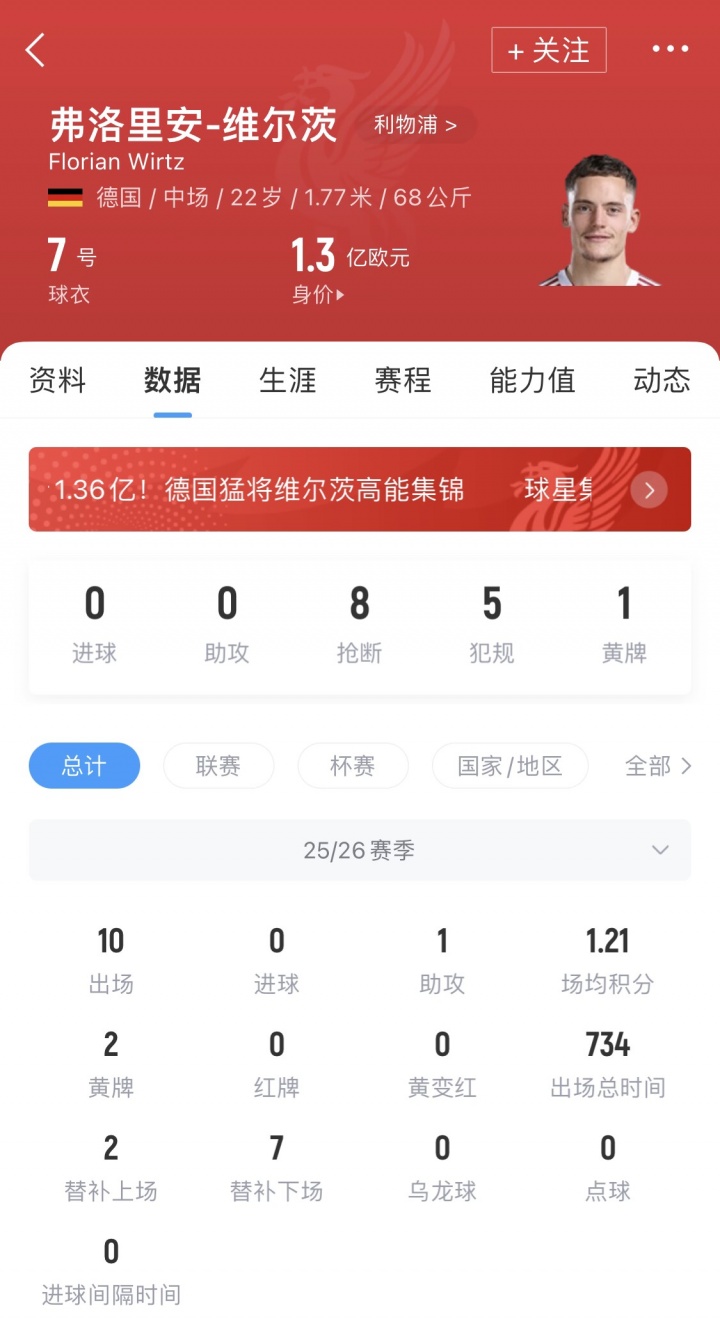 10月18日讯 德转昨日更新英超球员身价,今夏加盟利物浦的维尔茨身价下跌1000万欧,从蓝本的1.4亿调遣为1.3亿欧。