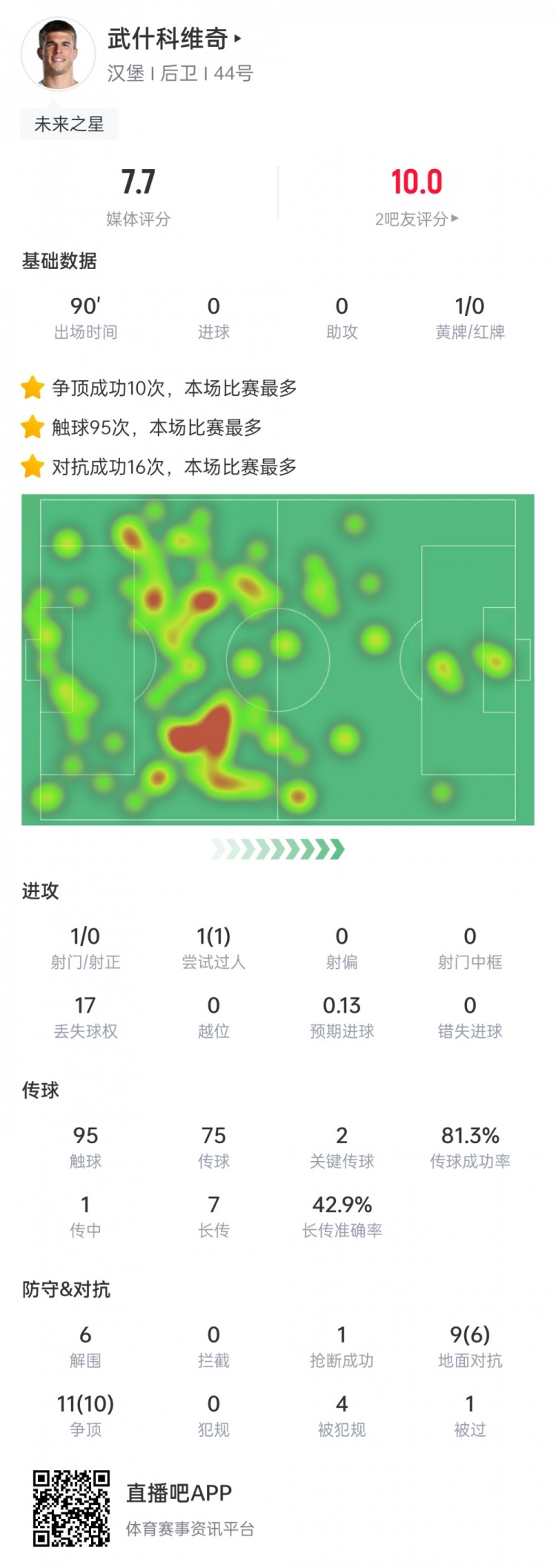 此役武什科维奇争顶收效10次,全场最多。据Sofascore统计,本赛季武什科维奇在2场联赛中争顶收效10+何况收效用跨越90%,而五大联赛其他2021名球员加起来也只作念到2次。