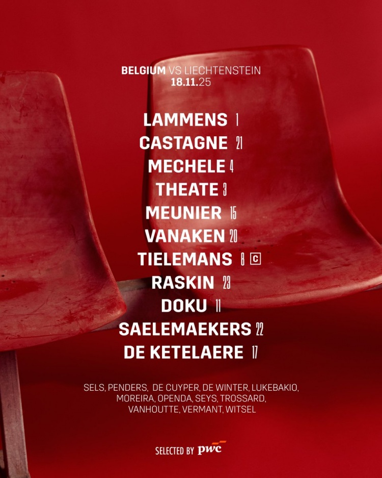 比利时首发:1-拉门斯、21-卡斯塔涅、4-梅切勒、3-泰特、15-穆尼耶、20-瓦纳肯、8-蒂莱曼斯、23-拉什金、11-多库、22-萨勒马科尔斯、17-德凯特拉雷