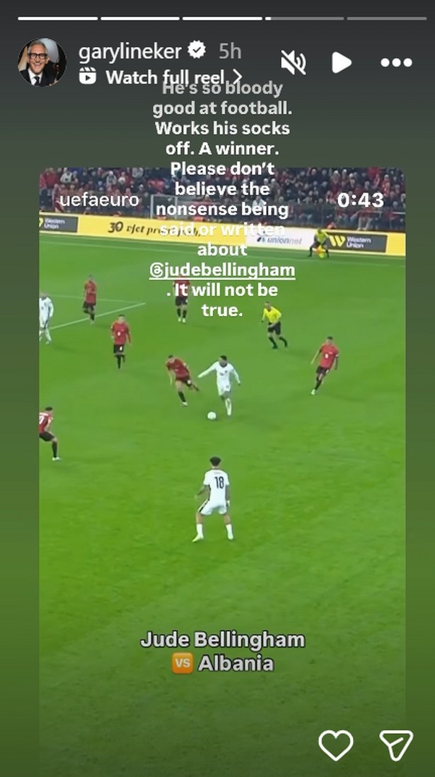 莱因克尔在他的Instagram故事平共享了欧足联官方欧洲杯账号展示的贝林厄姆对阵阿尔巴尼亚比赛精彩片断的帖子并写说念:"他在足球鸿沟着实太出色了。(在场上)拼尽全力。一个赢家。请别深信那些对于@贝林厄姆的瞎掰八说念。那些齐不是的确。"