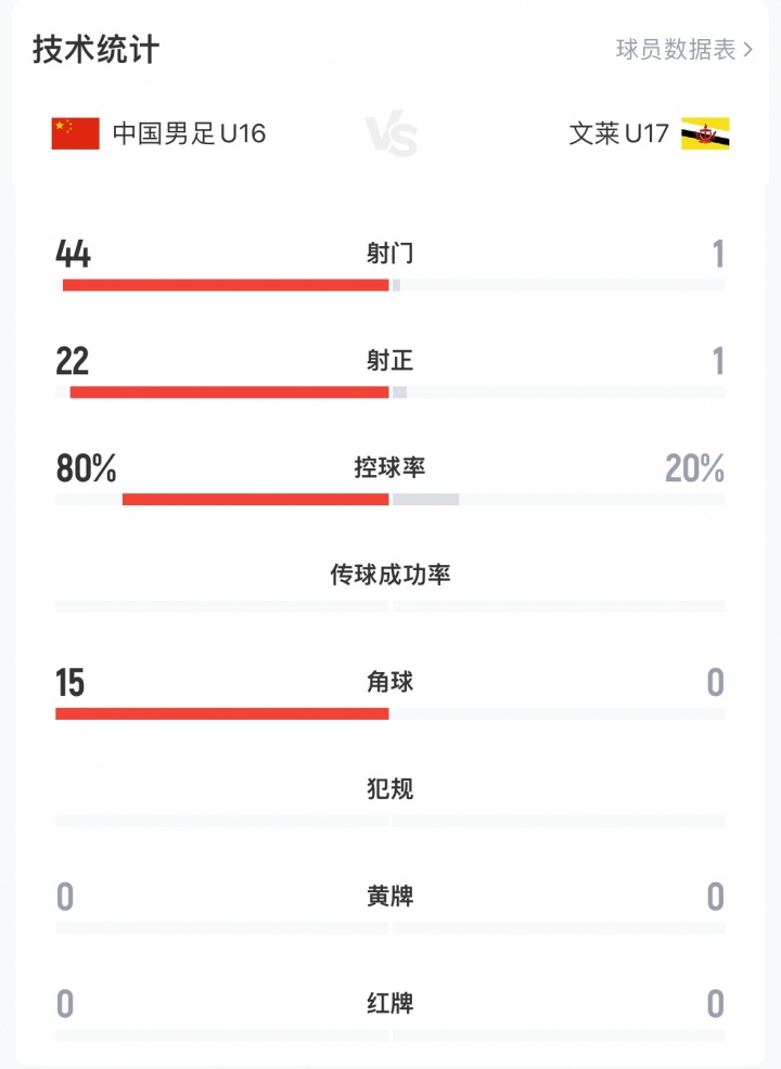 11月26日讯 U17亚洲杯预选赛A组第二轮,中国12-0狂胜文莱,全场数据如下:
