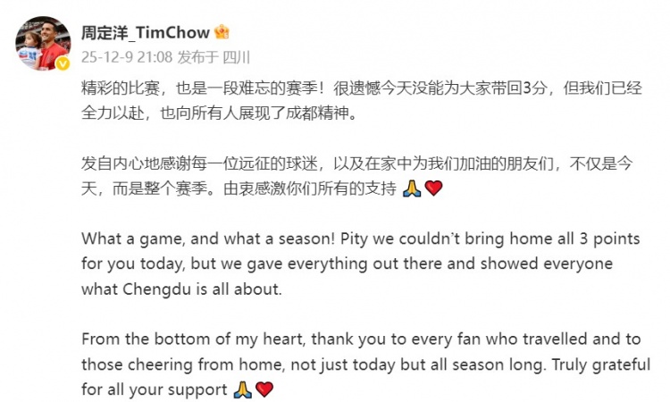 12月9日讯 亚冠精英联赛小组赛,成齐蓉城客场2-2战平神户胜仗船。赛后,蓉城球员周定洋更新了个东谈主外交媒体。