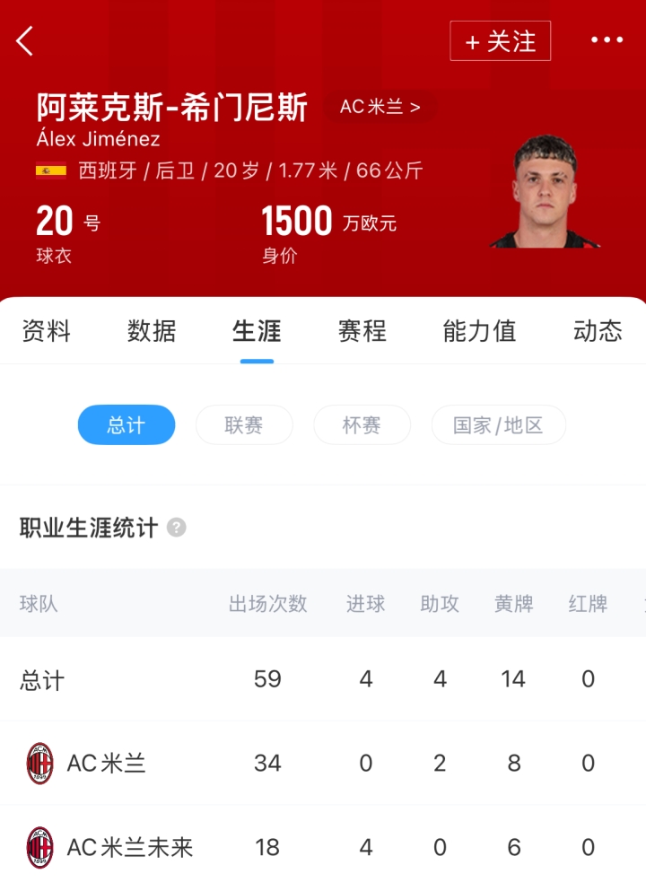 20岁的希门尼斯出自皇马青训,23/24赛季加入米兰青训,于今照旧代表米兰一线队各项赛事出战34场比赛。