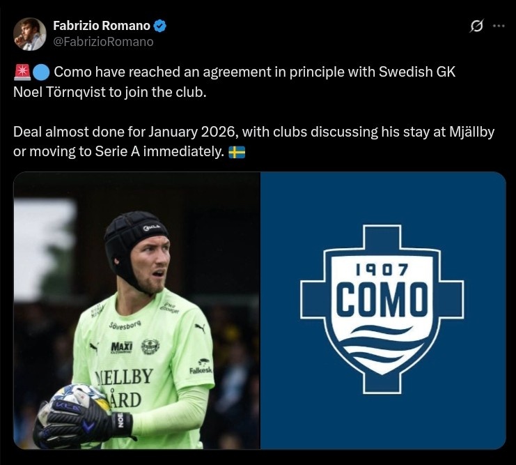 8月25日讯 据着名转会巨匠罗马诺报谈,科莫照旧与瑞典门将诺埃尔-托尔奎斯特齐全原则性一致。