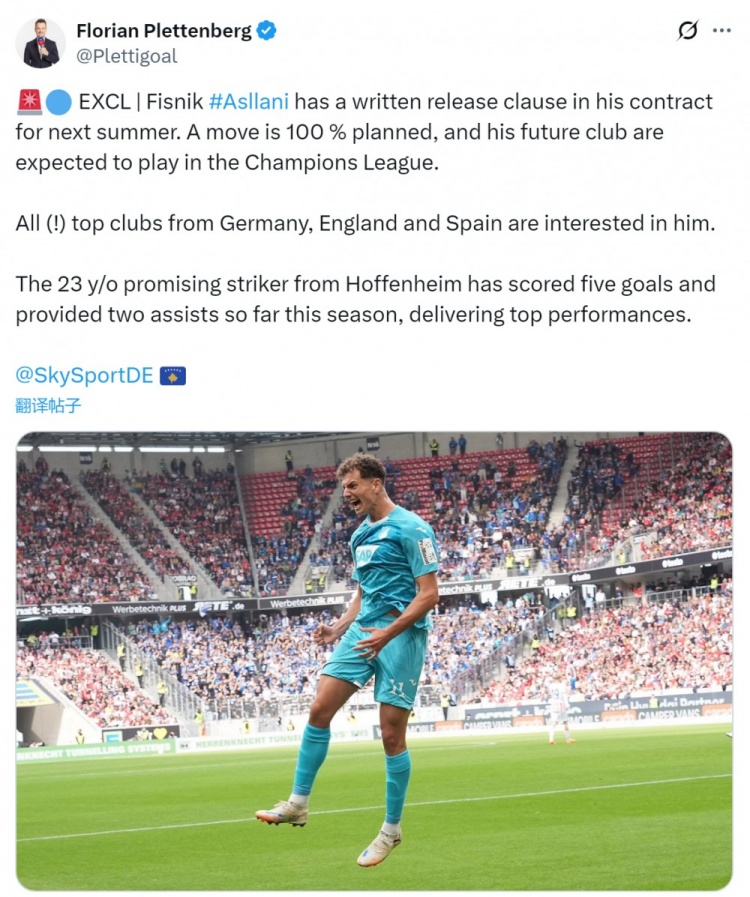 普莱滕伯格透露,阿斯拉尼与霍芬海姆的协议中存在明夏有用的书面解约条件,转会100%在球员的将来经营之中,预测他将加盟干涉欧冠的俱乐部。险些系数德国、英格兰、西班牙的顶级俱乐部齐对阿斯拉尼感兴味。