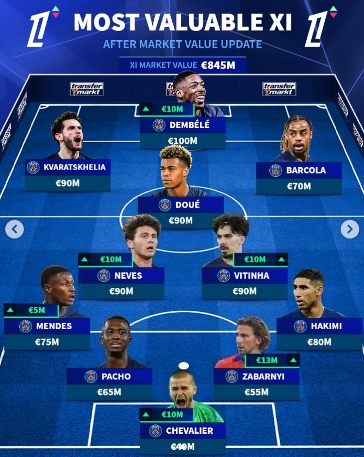 10月11日讯 德转更新了法甲球员身价,并清点了现在身价最高的11东谈主威望,巴黎球员包揽,具体如下: