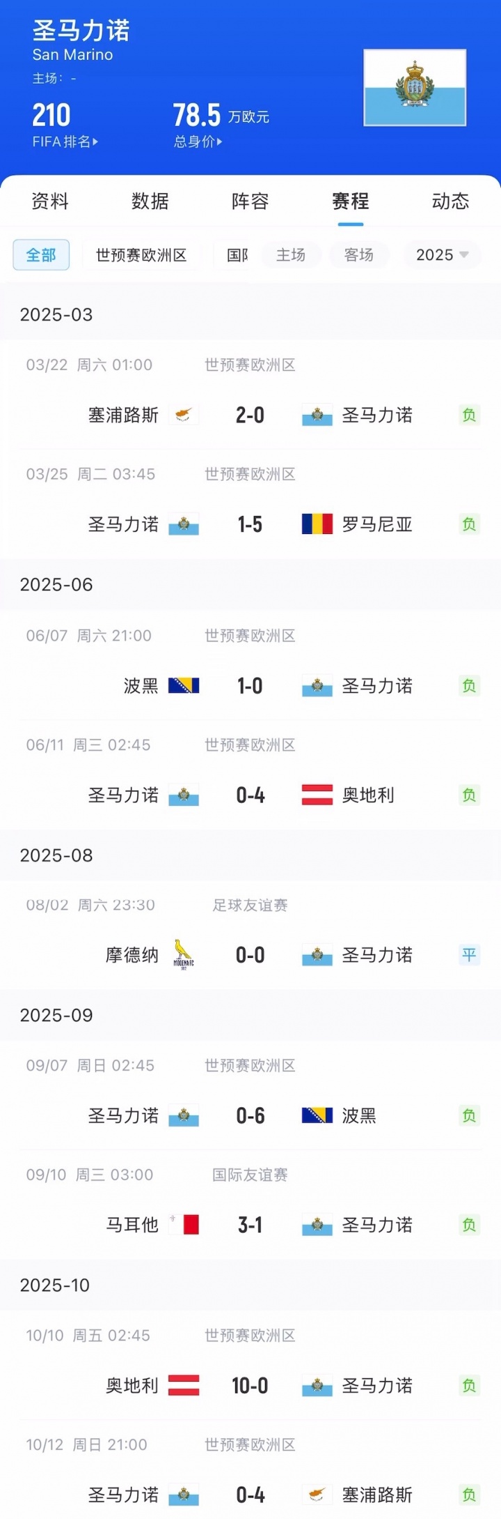 2025年于今,圣马力诺共出战了9场国外比赛,得回了1平8负的战绩,进失球比为惨淡的2-35。