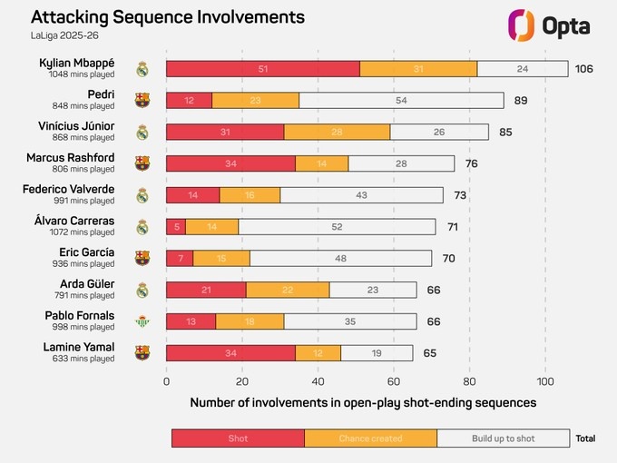 11月12日讯 据Opta统计,姆巴佩本赛季联赛参与106次以射门驱逐的要害,西甲球员中最多。