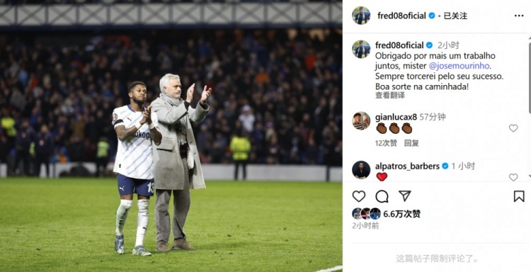 8月29日讯 费内巴切在今天认真宣布解老板帅穆里尼奥,费内巴切中场弗雷德更新社媒,发文牍别了穆帅。