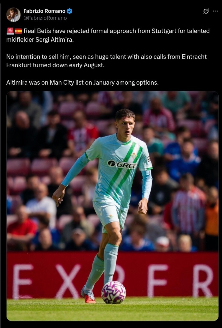8月26日讯 据盛名转会群众罗马诺报说念,贝蒂斯依然拒却了斯图加特关于24岁中场阿尔蒂米拉的认真报价。